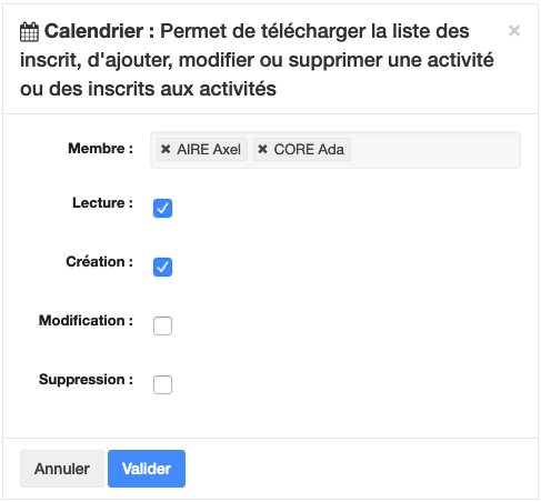 Possibilité de donner l'accès en lecture, création, modification, suppression (et/ou)